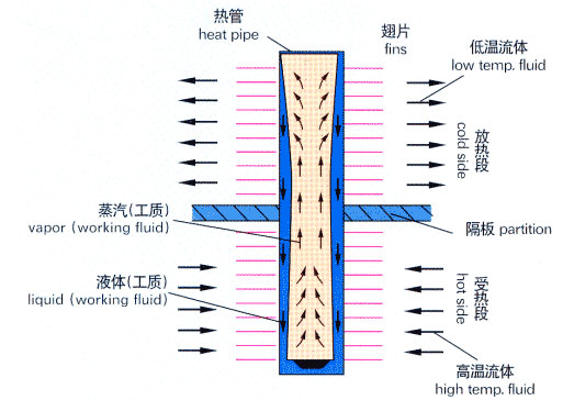 熱管受熱側(cè)吸收廢氣熱量,并將熱量傳給管內(nèi)工質(zhì)(液態(tài)),工質(zhì)吸熱后以蒸發(fā)與沸騰的形式轉(zhuǎn)變?yōu)檎羝,蒸汽在壓差作用下上升至放熱?cè),同時凝結(jié)成液體放出汽化潛熱,熱量傳給放熱側(cè)的冷流體,冷凝液體依靠重力回流到受熱側(cè)。 由于熱管內(nèi)部抽成真空,所以工質(zhì)極易蒸發(fā)與沸騰,熱管起動迅速。熱管在冷、熱兩側(cè)均可裝設(shè)翅片,以強化傳熱。